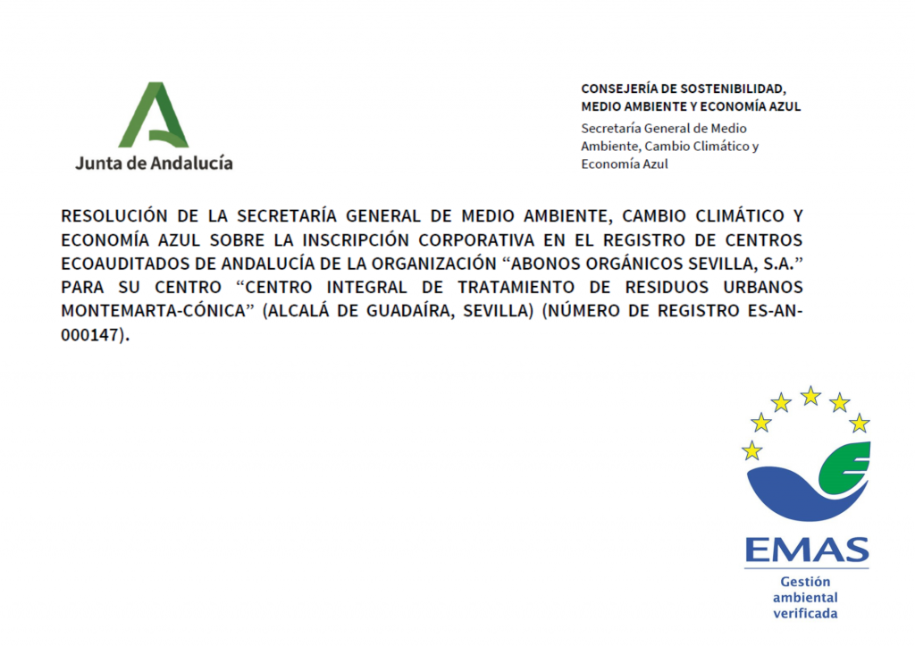 ABORGASE ha sido inscrita en el registro EMAS para el Centro Integral de Tratamiento de Residuos Urbanos Montemarta Cónica. Este reconocimiento, otorgado por la Secretaría General de Medio Ambiente, Agua y Cambio Climático de la Junta de Andalucía, refleja el compromiso con la mejora en la gestión ambiental y la sostenibilidad.
