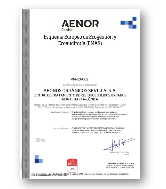 El Registro EMAS supondrá un importante logro para el área medioambiental de la organización que, con el esfuerzo continuo, ha conseguido formar un Sistema Integrado de Gestión cada vez más completo y afianzado, y que abarca las distintas áreas de la sostenibilidad: medioambiental (ISO 14001, ISO 50001, huellas de carbono, hídrica y ambiental), social (ISO 45001, plan de igualdad, Estrategia y Memorias de Sostenibilidad, Responsabilidad Social Corporativa) y económica (ISO 9001, ISO 19601 sobre Compliance Penal).