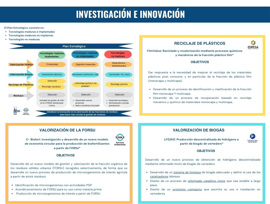 Estas líneas son la conversión de biogás, la valorización de materia orgánica y el reciclaje químico de plásticos no reciclables por métodos mecánicos.
