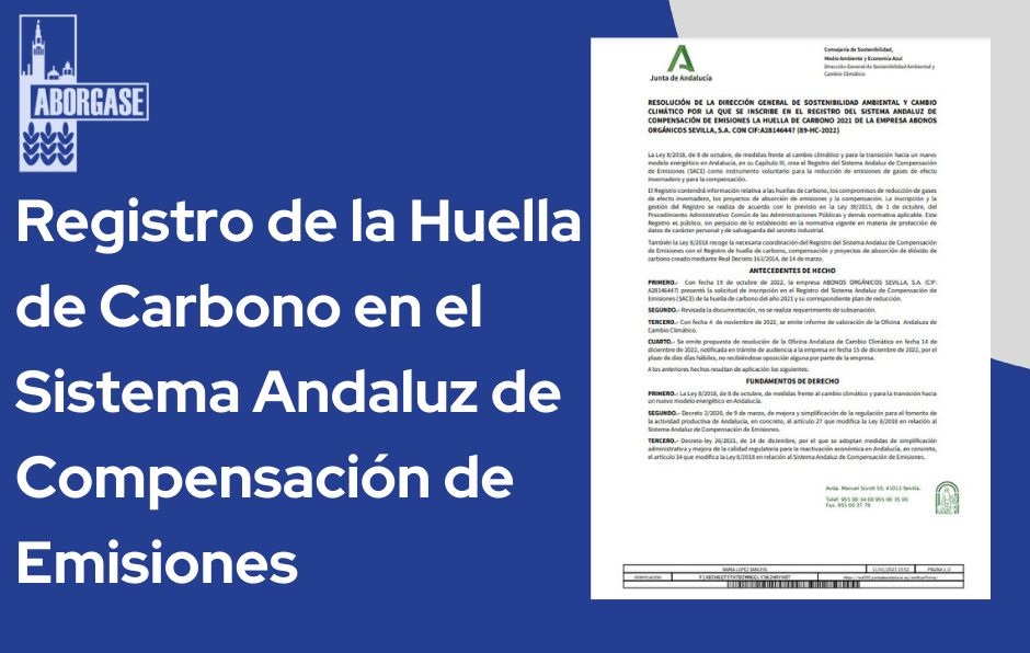 En este mes de enero se ha resuelto positivamente la solicitud de inscripción en el Registro del Sistema Andaluz de Compensación de Emisiones (SACE) de la huella de carbono de la Aborgase para el año 2021.