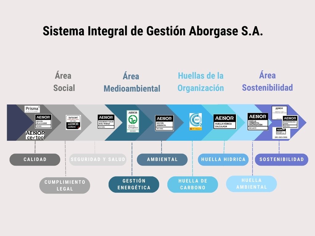 En Aborgase seguimos evolucionando hacia un Sistema Integrado de Gestión que incluyan todas las normas de certificación que nos ayudan a seguir creciendo en el sector de forma sostenible, transitando hacia una economía circular y climáticamente neutra.